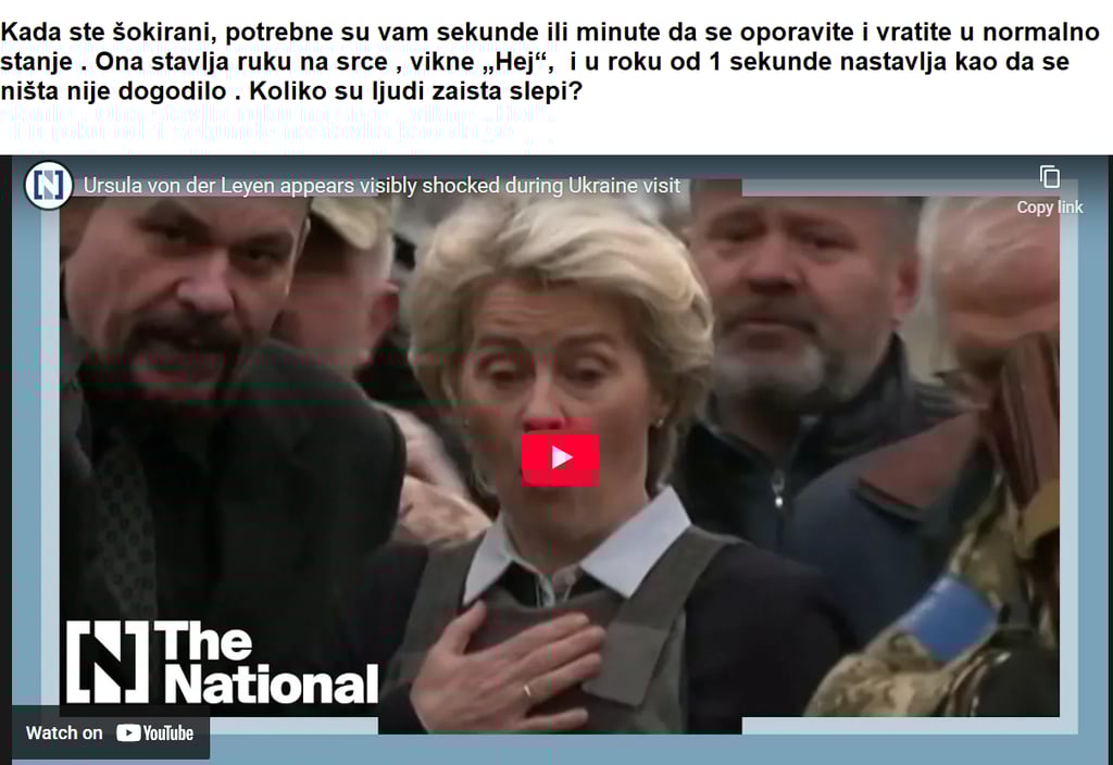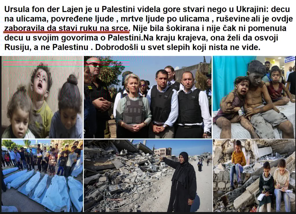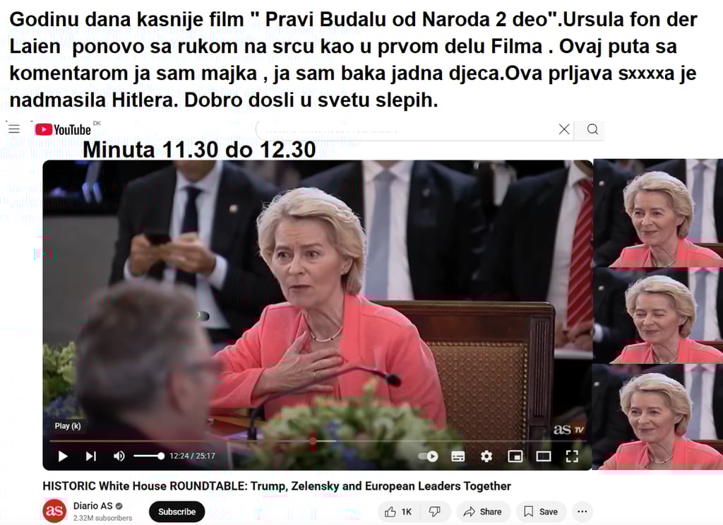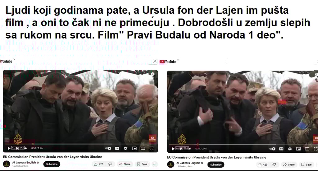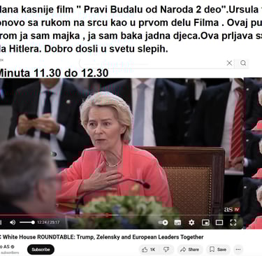 To je veoma tuzno gledat kako ih Nemci za budale imaju kad pogledate koliko ljudi ima ali samo Ursula von der Leyen je sokirana na video se vidiju crne zatvorene torbe I desetine ljudi ali samo Ursula von der Leyen je sokirana sa rukom na srcu to mozemo sada da zovemo Nemacki smrad.Nekoliko meseci kasnije drugi deo tog prljavog filma na sastanku sa trampu opet pocine da prica o deci . Ja sam majka, ja sam baka, jadna deca. Bila je na toliko mnogo mesta gde je videla ne samo crne vreće već i ranjenu i mrtvu decu, uplakane majke, uništene kuće, i nigde nije stavila ruku na srce, čak ni pomenula to. Ako pogledamo odeljak o nemačkoj istoriji na ovoj veb stranici, oni rade istu stvar od 1939. godine do danas 2025: siluju, muče, a u nekim slučajevima i ubijaju milione dece. Nažalost, ljudi imaju vrlo malo inteligencije i ne vide šta izvode, ovu šaradu sa rukom na srcu. Od 1939. do danas, 2025. godine, Nemci rade istu stvar iznova i iznova, i ona stavlja ruku na srce. Kako neko može biti toliko prljav i pokvaren da se tako pretvara pred ljudima? Čak ni Hitler nije uradio ništa slično.